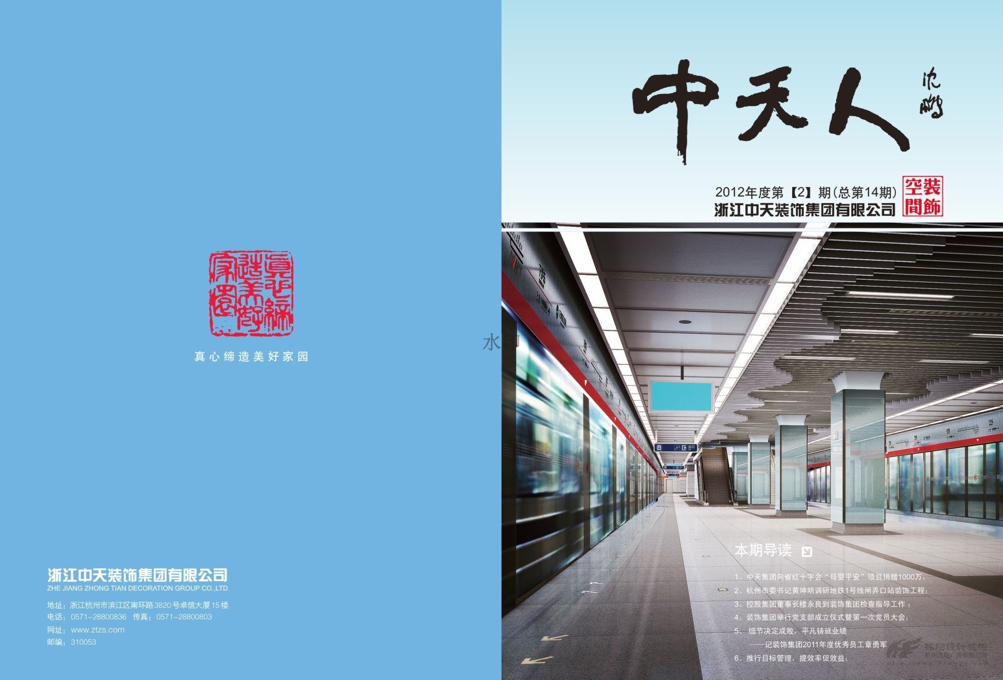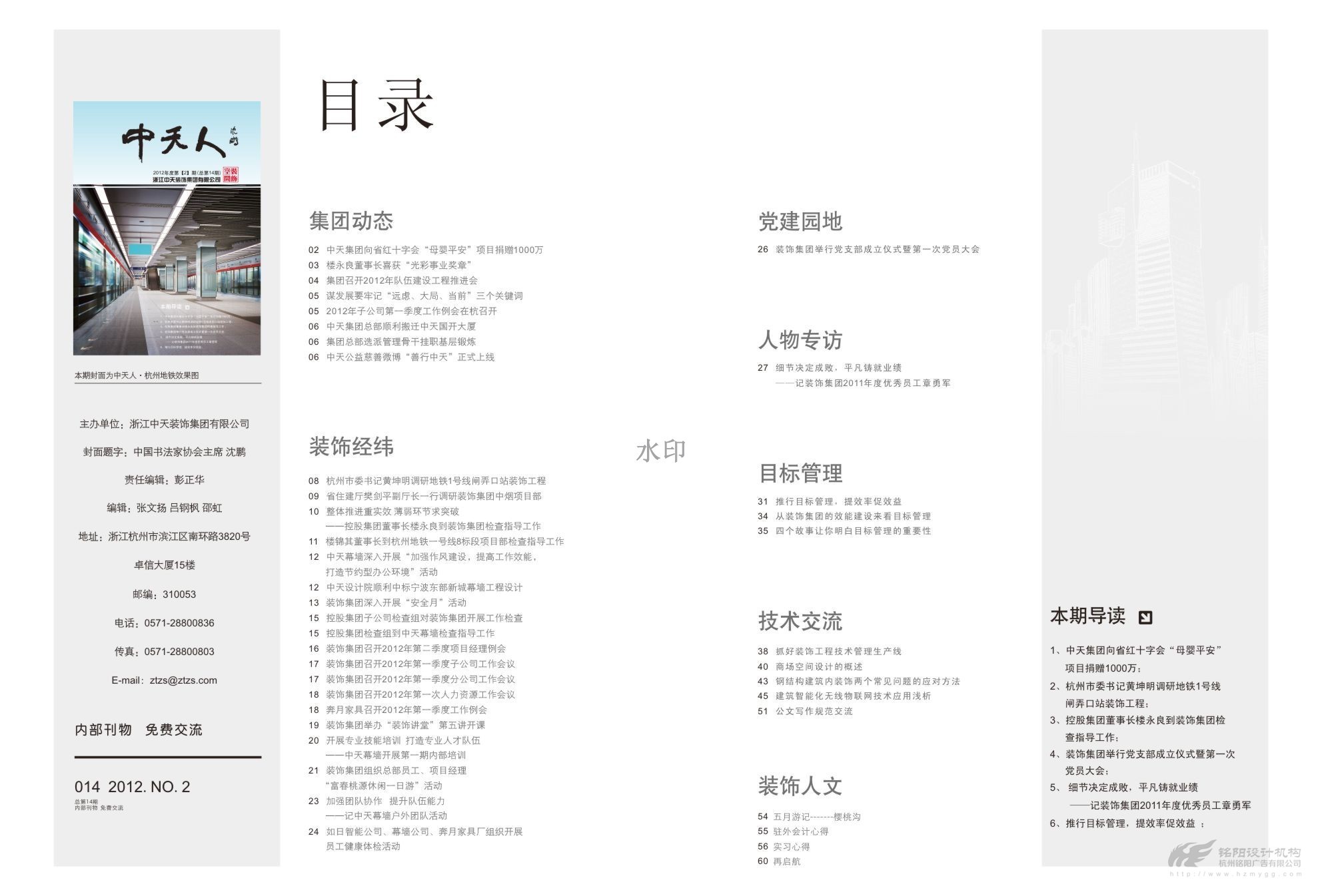 中國企業(yè)500強企業(yè),中國民營企業(yè)50強企業(yè),中天發(fā)展控股集團(tuán)有限公司(簡稱“中天集團(tuán)”)是一家以土木建筑、地產(chǎn)置業(yè)、電子??化工、投資為主要經(jīng)營業(yè)務(wù)的全國大型企業(yè)集團(tuán)。2013年總產(chǎn)值及銷售額超600億元。下轄中天建設(shè)集團(tuán)有限公司,浙江中天房產(chǎn)集團(tuán)有限公司,中天西北建設(shè)投資集團(tuán)有限公司,浙江中天裝飾集團(tuán)有限公司,浙江新嘉聯(lián)電子股份有限公司,浙江中天氟硅材料有限公司等10多家成員企業(yè)。 銘陽與中天集團(tuán)建立多年伙伴關(guān)系,為中天裝飾,中天建設(shè)等提供多次平面設(shè)計服務(wù),包括月刊、畫冊、說明書、文化形象等。